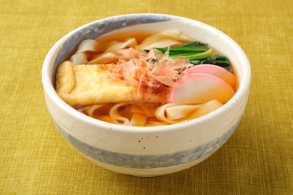 Flat and wide udon noodles served in a light soy-based broth. Topped with bonito flakes, green onions, and tempura, this dish is simple yet deeply satisfying.