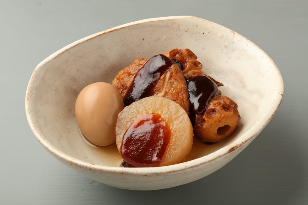 A Nagoya twist on traditional oden, this dish features ingredients like daikon radish, eggs, and konjac simmered in a robust red miso sauce.