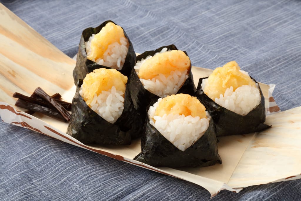 A delightful fusion of shrimp tempura and rice balls (onigiri). These bite-sized treats are portable and perfect for on-the-go meals or picnics.